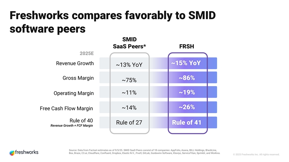 Freshworks compares favorably to SMID software peers SMID SaaS Peers* FRSH 2025E Revenue Growth ~15% YoY ~13% YoY Gross Margin ~86% ~75% ~19% ~11% Operating Margin ~26% ~14% Free Cash Flow Margin Rule of 40 Rule of 27 Rule of 41 Revenue Growth + FCF Margin Source: Data from Factset estimates as of 9/5/25. SMID SaaS Peers consist of 18 companies: AppFolio, Asana, BILL Holdings, BlackLine, Box, Braze, C3.ai, Cloudflare, Confluent, Dropbox, Elastic N.V., Five9, GitLab, Guidewire Software, Klaviyo, ServiceTitan, Sprinklr, and Workiva. © 2025 Freshworks Inc. All rights reserved.