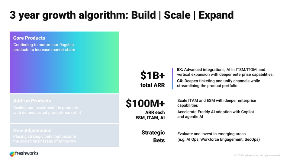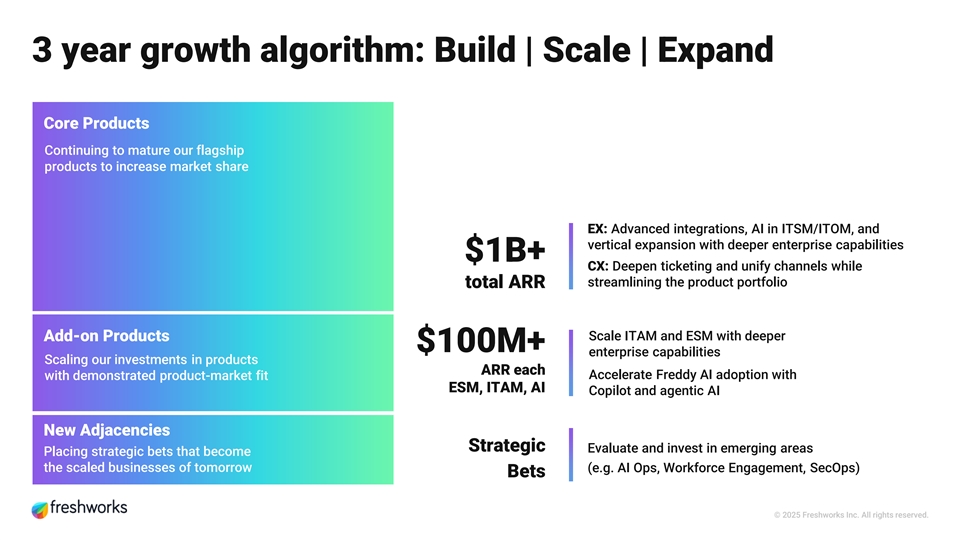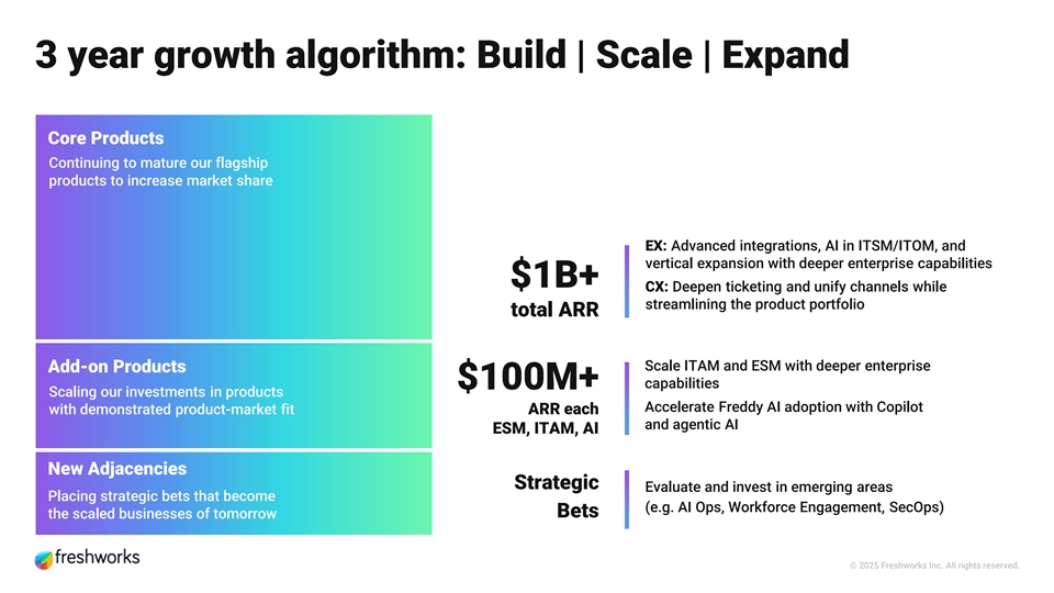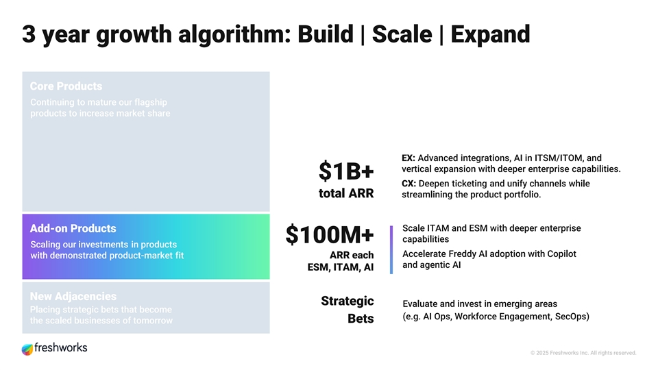 3 year growth algorithm: Build | Scale | Expand Core Products Continuing to mature our flagship New Adjacencies products to increase market share EX: Advanced integrations, AI in ITSM/ITOM, and vertical expansion with deeper enterprise capabilities. $1B+ CX: Deepen ticketing and unify channels while total ARR streamlining the product portfolio. Scale ITAM and ESM with deeper enterprise Add-on Products capabilities $100M+ Scaling our investments in products Accelerate Freddy AI adoption with Copilot with demonstrated product-market fit ARR each and agentic AI ESM, ITAM, AI New Adjacencies Strategic Evaluate and invest in emerging areas Placing strategic bets that become (e.g. AI Ops, Workforce Engagement, SecOps) the scaled businesses of tomorrow Bets © 2025 Freshworks Inc. All rights reserved.
