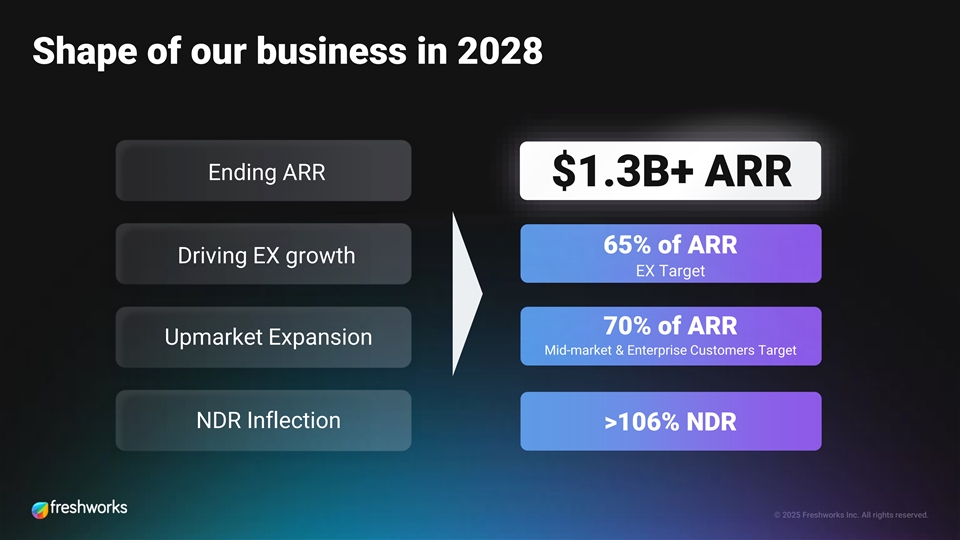 Shape of our business in 2028 Ending ARR $1.3B+ ARR 65% of ARR Driving EX growth EX Target 70% of ARR Upmarket Expansion Mid-market & Enterprise Customers Target NDR Inflection >106% NDR © 2025 Freshworks Inc. All rights reserved.
