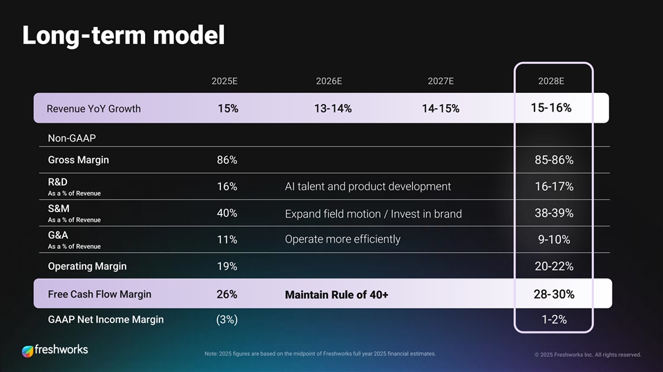 Long-term model 2025E 2026E 2027E 2028E Revenue YoY Growth 15% 13-14% 14-15% 15-16% Non-GAAP Gross Margin 86% 85-86% R&D 16% AI talent and product development 16-17% As a % of Revenue S&M 40% 38-39% Expand field motion / Invest in brand As a % of Revenue G&A 11% Operate more efficiently 9-10% As a % of Revenue Operating Margin 19% 20-22% Free Cash Flow Margin 26% Maintain Rule of 40+ 28-30% GAAP Net Income Margin (3%) 1-2% Note: 2025 figures are based on the midpoint of Freshworks full year 2025 financial estimates. © 2025 Freshworks Inc. All rights reserved.