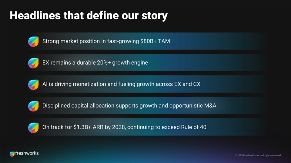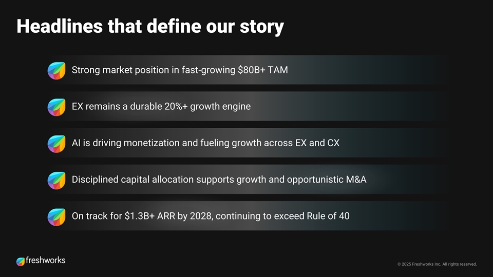 Headlines that define our story Strong market position in fast-growing $80B+ TAM EX remains a durable 20%+ growth engine AI is driving monetization and fueling growth across EX and CX Disciplined capital allocation supports growth and opportunistic M&A On track for $1.3B+ ARR by 2028, continuing to exceed Rule of 40 © 2025 Freshworks Inc. All rights reserved.