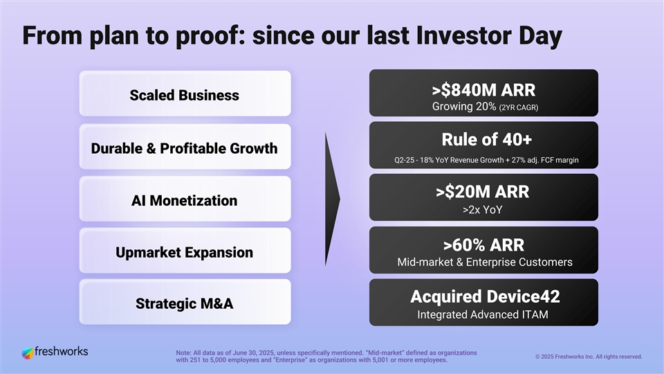 From plan to proof: since our last Investor Day >$840M ARR Scaled Business Growing 20% (2YR CAGR) Rule of 40+ Durable & Profitable Growth Q2-25 - 18% YoY Revenue Growth + 27% adj. FCF margin >$20M ARR AI Monetization >2x YoY >60% ARR Upmarket Expansion Mid-market & Enterprise Customers Acquired Device42 Strategic M&A Integrated Advanced ITAM Note: All data as of June 30, 2025, unless specifically mentioned. “Mid-market” defined as organizations © © 2 20 02 25 5 F Fr re es sh hwo wor rks ks Inc. Inc. All All r ri ig gh ht ts s r re es se er rv ve ed d. . with 251 to 5,000 employees and “Enterprise” as organizations with 5,001 or more employees.