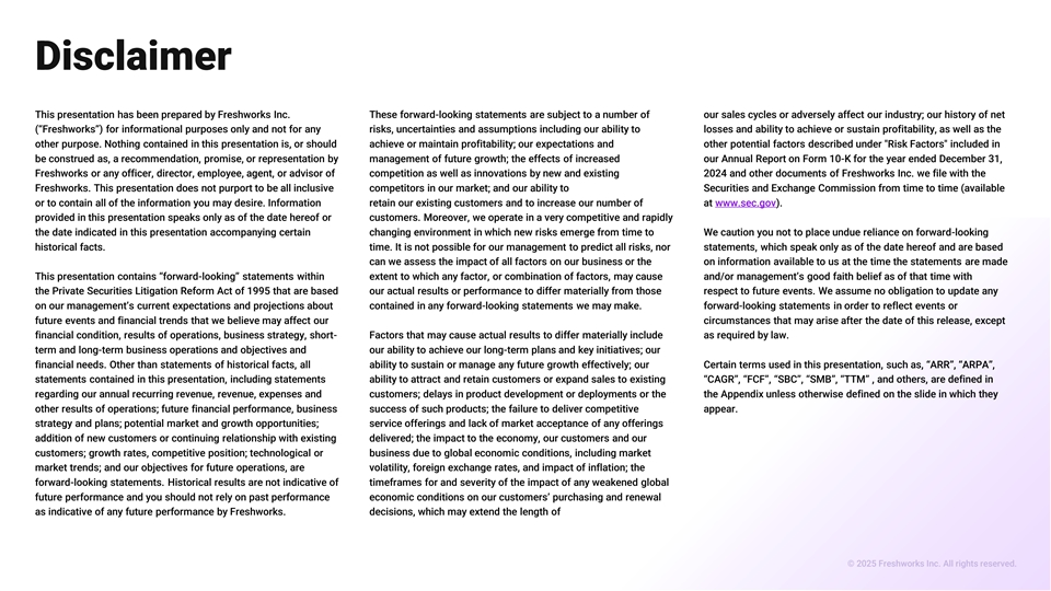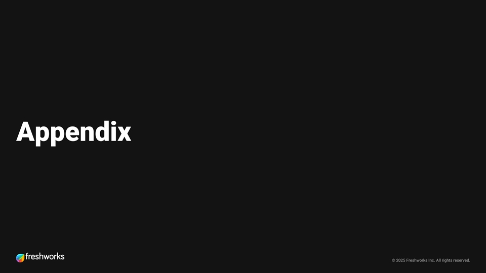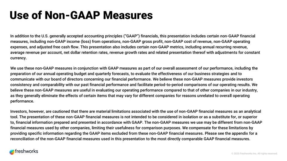 Use of Non-GAAP Measures In addition to the U.S. generally accepted accounting principles (“GAAP”) financials, this presentation includes certain non-GAAP financial measures, including non-GAAP income (loss) from operations, non-GAAP gross profit, non-GAAP cost of revenue, non-GAAP operating expenses, and adjusted free cash flow. This presentation also includes certain non-GAAP metrics, including annual recurring revenue, average revenue per account, net dollar retention rates, revenue growth rates and related presentation thereof with adjustments for constant currency. We use these non-GAAP measures in conjunction with GAAP measures as part of our overall assessment of our performance, including the preparation of our annual operating budget and quarterly forecasts, to evaluate the effectiveness of our business strategies and to communicate with our board of directors concerning our financial performance. We believe these non-GAAP measures provide investors consistency and comparability with our past financial performance and facilitate period-to-period comparisons of our operating results. We believe these non-GAAP measures are useful in evaluating our operating performance compared to that of other companies in our industry, as they generally eliminate the effects of certain items that may vary for different companies for reasons unrelated to overall operating performance. Investors, however, are cautioned that there are material limitations associated with the use of non-GAAP financial measures as an analytical tool. The presentation of these non-GAAP financial measures is not intended to be considered in isolation or as a substitute for, or superior to, financial information prepared and presented in accordance with GAAP. The non-GAAP measures we use may be different from non-GAAP financial measures used by other companies, limiting their usefulness for comparison purposes. We compensate for these limitations by providing specific information regarding the GAAP items excluded from these non-GAAP financial measures. Please see the appendix for a reconciliation of the non-GAAP financial measures used in this presentation to the most directly comparable GAAP financial measures. © 2025 Freshworks Inc. All rights reserved.