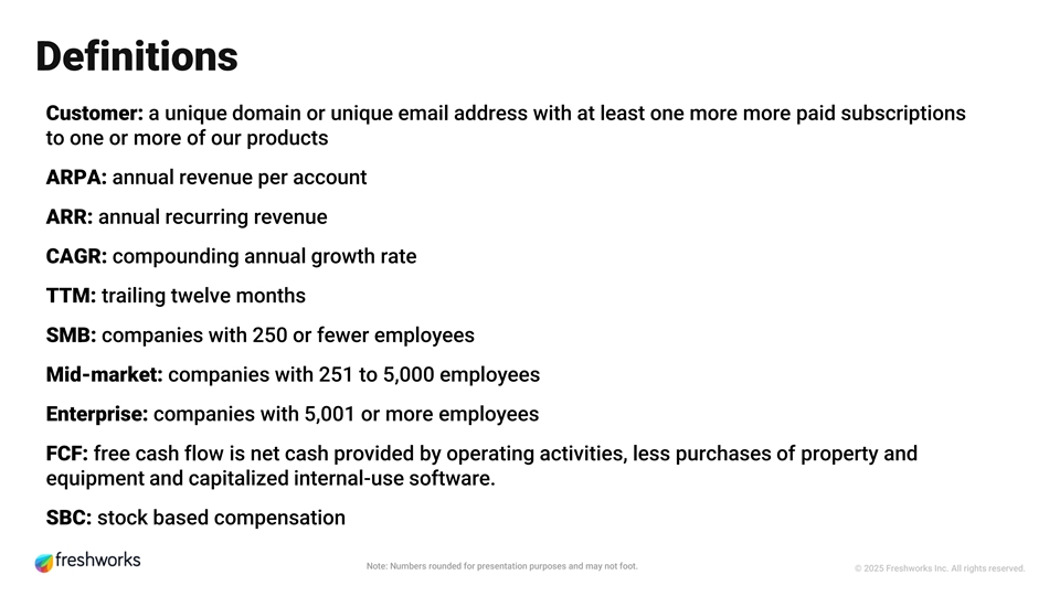 Definitions Customer: a unique domain or unique email address with at least one more more paid subscriptions to one or more of our products ARPA: annual revenue per account ARR: annual recurring revenue CAGR: compounding annual growth rate TTM: trailing twelve months SMB: companies with 250 or fewer employees Mid-market: companies with 251 to 5,000 employees Enterprise: companies with 5,001 or more employees FCF: free cash flow is net cash provided by operating activities, less purchases of property and equipment and capitalized internal-use software. SBC: stock based compensation Note: Numbers rounded for presentation purposes and may not foot. © 2025 Freshworks Inc. All rights reserved.
