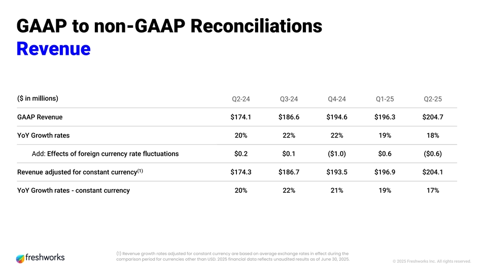 GAAP to non-GAAP Reconciliations Revenue ($ in millions) Q2-24 Q3-24 Q4-24 Q1-25 Q2-25 GAAP Revenue $174.1 $186.6 $194.6 $196.3 $204.7 YoY Growth rates 20% 22% 22% 19% 18% Add: Effects of foreign currency rate fluctuations $0.2 $0.1 ($1.0) $0.6 ($0.6) (1) Revenue adjusted for constant currency $174.3 $186.7 $193.5 $196.9 $204.1 YoY Growth rates - constant currency 20% 22% 21% 19% 17% (1) Revenue growth rates adjusted for constant currency are based on average exchange rates in effect during the comparison period for currencies other than USD. 2025 financial data reflects unaudited results as of June 30, 2025. © 2025 Freshworks Inc. All rights reserved.