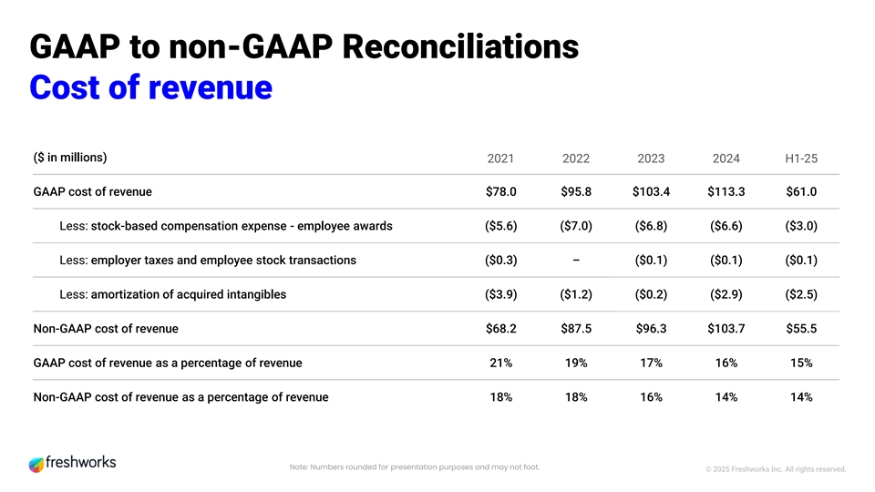 GAAP to non-GAAP Reconciliations Cost of revenue ($ in millions) 2021 2022 2023 2024 H1-25 GAAP cost of revenue $78.0 $95.8 $103.4 $113.3 $61.0 Less: stock-based compensation expense - employee awards ($5.6) ($7.0) ($6.8) ($6.6) ($3.0) Less: employer taxes and employee stock transactions ($0.3) – ($0.1) ($0.1) ($0.1) Less: amortization of acquired intangibles ($3.9) ($1.2) ($0.2) ($2.9) ($2.5) Non-GAAP cost of revenue $68.2 $87.5 $96.3 $103.7 $55.5 GAAP cost of revenue as a percentage of revenue 21% 19% 17% 16% 15% Non-GAAP cost of revenue as a percentage of revenue 18% 18% 16% 14% 14% Note: Numbers rounded for presentation purposes and may not foot. © 2025 Freshworks Inc. All rights reserved.