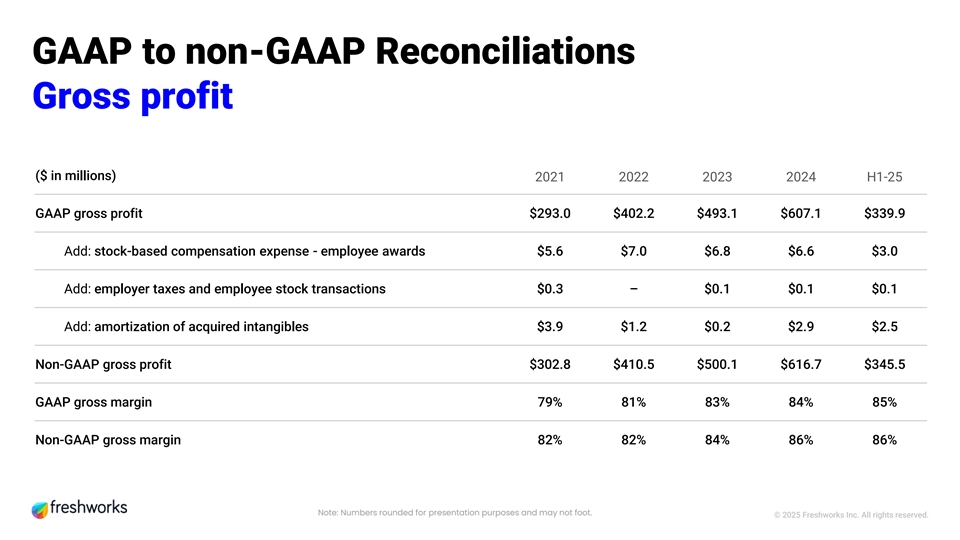 GAAP to non-GAAP Reconciliations Gross profit ($ in millions) 2021 2022 2023 2024 H1-25 GAAP gross profit $293.0 $402.2 $493.1 $607.1 $339.9 Add: stock-based compensation expense - employee awards $5.6 $7.0 $6.8 $6.6 $3.0 Add: employer taxes and employee stock transactions $0.3 – $0.1 $0.1 $0.1 Add: amortization of acquired intangibles $3.9 $1.2 $0.2 $2.9 $2.5 Non-GAAP gross profit $302.8 $410.5 $500.1 $616.7 $345.5 GAAP gross margin 79% 81% 83% 84% 85% Non-GAAP gross margin 82% 82% 84% 86% 86% Note: Numbers rounded for presentation purposes and may not foot. © 2025 Freshworks Inc. All rights reserved.