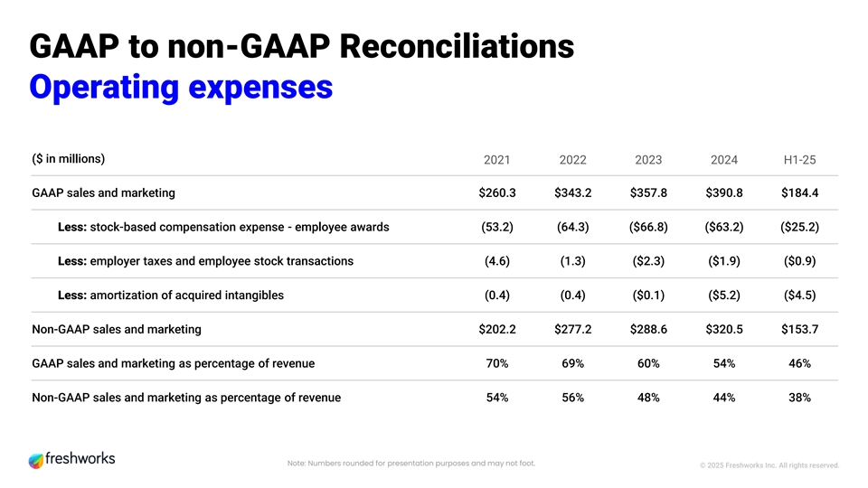 GAAP to non-GAAP Reconciliations Operating expenses ($ in millions) 2021 2022 2023 2024 H1-25 GAAP sales and marketing $260.3 $343.2 $357.8 $390.8 $184.4 Less: stock-based compensation expense - employee awards (53.2) (64.3) ($66.8) ($63.2) ($25.2) Less: employer taxes and employee stock transactions (4.6) (1.3) ($2.3) ($1.9) ($0.9) Less: amortization of acquired intangibles (0.4) (0.4) ($0.1) ($5.2) ($4.5) Non-GAAP sales and marketing $202.2 $277.2 $288.6 $320.5 $153.7 GAAP sales and marketing as percentage of revenue 70% 69% 60% 54% 46% Non-GAAP sales and marketing as percentage of revenue 54% 56% 48% 44% 38% Note: Numbers rounded for presentation purposes and may not foot. © 2025 Freshworks Inc. All rights reserved.
