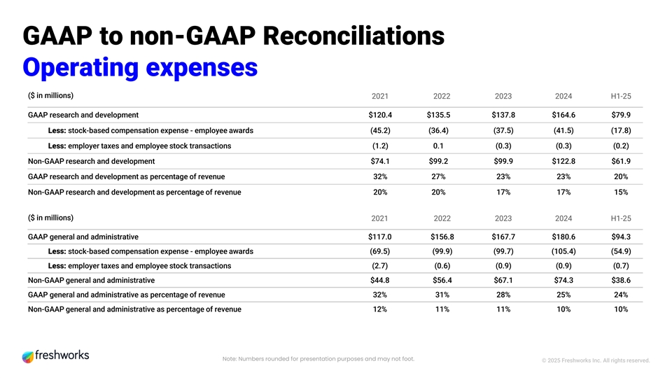 GAAP to non-GAAP Reconciliations Operating expenses ($ in millions) 2021 2022 2023 2024 H1-25 GAAP research and development $120.4 $135.5 $137.8 $164.6 $79.9 Less: stock-based compensation expense - employee awards (45.2) (36.4) (37.5) (41.5) (17.8) Less: employer taxes and employee stock transactions (1.2) 0.1 (0.3) (0.3) (0.2) Non-GAAP research and development $74.1 $99.2 $99.9 $122.8 $61.9 GAAP research and development as percentage of revenue 32% 27% 23% 23% 20% Non-GAAP research and development as percentage of revenue 20% 20% 17% 17% 15% ($ in millions) 2021 2022 2023 2024 H1-25 GAAP general and administrative $117.0 $156.8 $167.7 $180.6 $94.3 Less: stock-based compensation expense - employee awards (69.5) (99.9) (99.7) (105.4) (54.9) Less: employer taxes and employee stock transactions (2.7) (0.6) (0.9) (0.9) (0.7) Non-GAAP general and administrative $44.8 $56.4 $67.1 $74.3 $38.6 GAAP general and administrative as percentage of revenue 32% 31% 28% 25% 24% Non-GAAP general and administrative as percentage of revenue 12% 11% 11% 10% 10% Note: Numbers rounded for presentation purposes and may not foot. © 2025 Freshworks Inc. All rights reserved.
