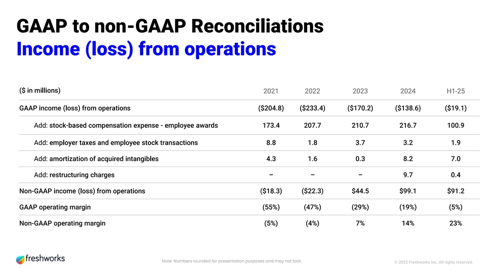 GAAP to non-GAAP Reconciliations Income (loss) from operations ($ in millions) 2021 2022 2023 2024 H1-25 GAAP income (loss) from operations ($204.8) ($233.4) ($170.2) ($138.6) ($19.1) Add: stock-based compensation expense - employee awards 173.4 207.7 210.7 216.7 100.9 Add: employer taxes and employee stock transactions 8.8 1.8 3.7 3.2 1.9 Add: amortization of acquired intangibles 4.3 1.6 0.3 8.2 7.0 Add: restructuring charges – – – 9.7 0.4 Non-GAAP income (loss) from operations ($18.3) ($22.3) $44.5 $99.1 $91.2 GAAP operating margin (55%) (47%) (29%) (19%) (5%) Non-GAAP operating margin (5%) (4%) 7% 14% 23% Note: Numbers rounded for presentation purposes and may not foot. © 2025 Freshworks Inc. All rights reserved.