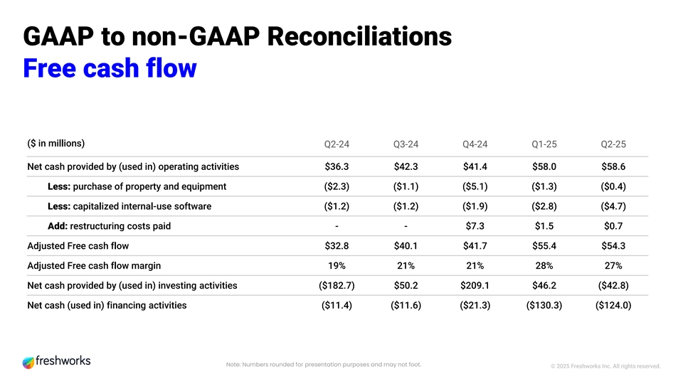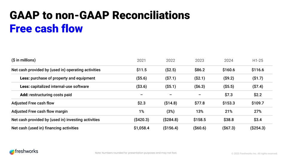 GAAP to non-GAAP Reconciliations Free cash flow ($ in millions) 2021 2022 2023 2024 H1-25 Net cash provided by (used in) operating activities $11.5 ($2.5) $86.2 $160.6 $116.6 Less: purchase of property and equipment ($5.6) ($7.1) ($2.1) ($9.2) ($1.7) Less: capitalized internal-use software ($3.6) ($5.1) ($6.3) ($5.5) ($7.4) Add: restructuring costs paid – – – $7.3 $2.2 Adjusted Free cash flow $2.3 ($14.8) $77.8 $153.3 $109.7 Adjusted Free cash flow margin 1% (3%) 13% 21% 27% Net cash provided by (used in) investing activities ($420.3) ($284.8) $158.5 $38.8 $3.4 Net cash (used in) financing activities $1,058.4 ($156.4) ($60.6) ($67.3) ($254.3) Note: Numbers rounded for presentation purposes and may not foot. © 2025 Freshworks Inc. All rights reserved.
