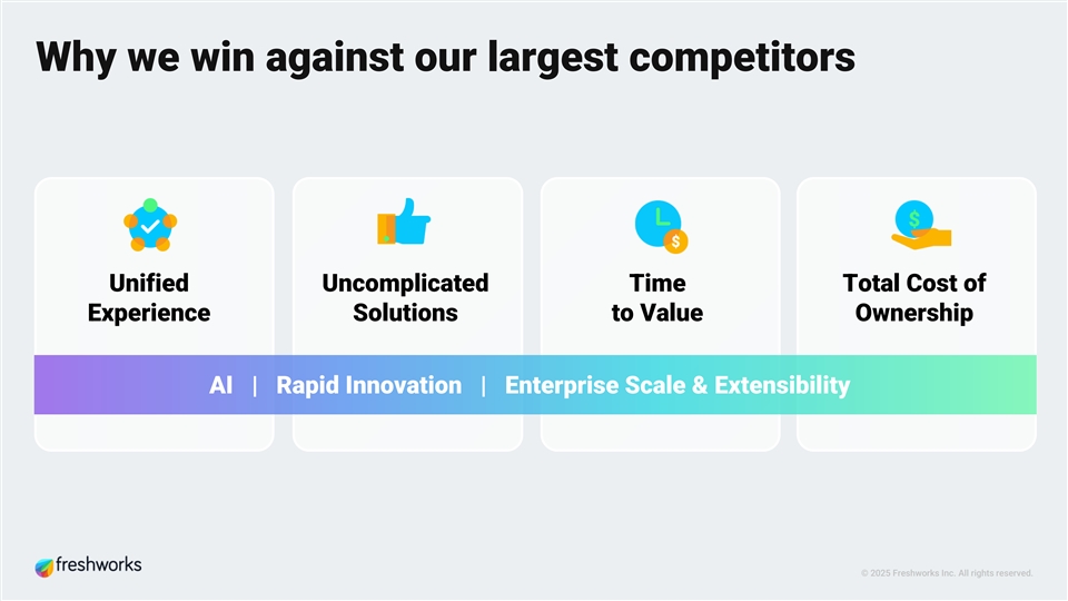 Why we win against our largest competitors Unified Uncomplicated Time Total Cost of Experience Solutions to Value Ownership AI | Rapid Innovation | Enterprise Scale & Extensibility © 2025 Freshworks Inc. All rights reserved.