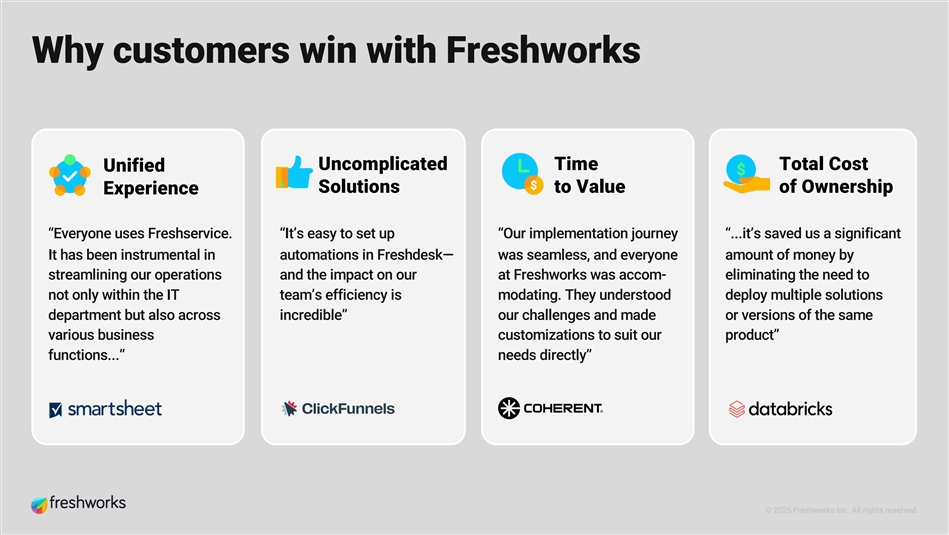 Why customers win with Freshworks Uncomplicated Time Total Cost Unified Solutions to Value of Ownership Experience “Everyone uses Freshservice. “It’s easy to set up “Our implementation journey “...it’s saved us a significant It has been instrumental in automations in Freshdesk— was seamless, and everyone amount of money by streamlining our operations and the impact on our at Freshworks was accom- eliminating the need to not only within the IT team’s efficiency is modating. They understood deploy multiple solutions department but also across incredible” our challenges and made or versions of the same various business customizations to suit our product” functions...” needs directly” © 2025 Freshworks Inc. All rights reserved.