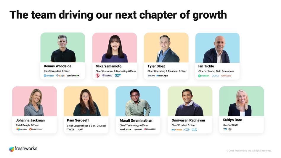 The team driving our next chapter of growth Dennis Woodside Mika Yamamoto Tyler Sloat Ian Tickle Chief Executive Officer Chief Customer & Marketing Officer Chief Operating & Financial Officer Chief of Global Field Operations Kaitlyn Bate Johanna Jackman Pam Sergeeff Murali Swaminathan Srinivasan Raghavan Chief of Staff Chief People Officer Chief Product Officer Chief Legal Officer & Gen. Counsel Chief Technology Officer © 2025 Freshworks Inc. All rights reserved.
