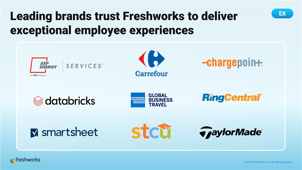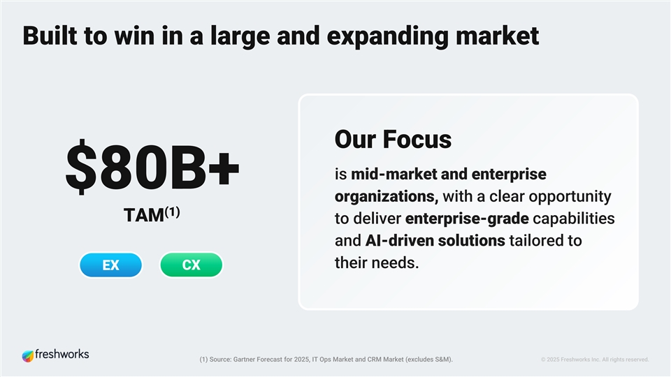 Built to win in a large and expanding market Our Focus is mid-market and enterprise $80B+ organizations, with a clear opportunity (1) TAM to deliver enterprise-grade capabilities and AI-driven solutions tailored to their needs. EX CX © 2025 Freshworks Inc. All rights reserved. (1) Source: Gartner Forecast for 2025, IT Ops Market and CRM Market (excludes S&M).