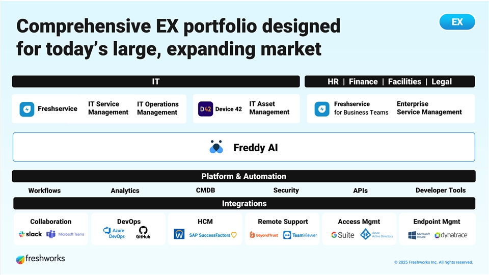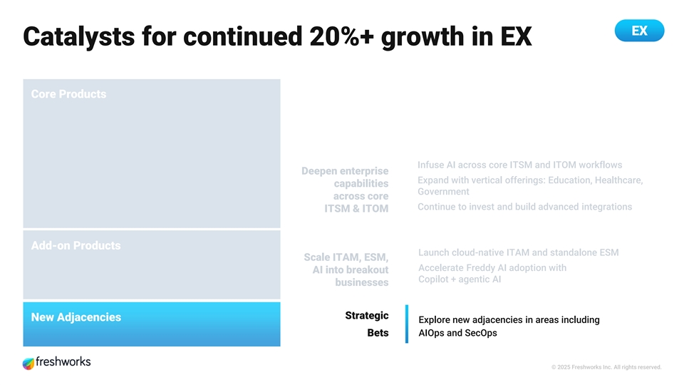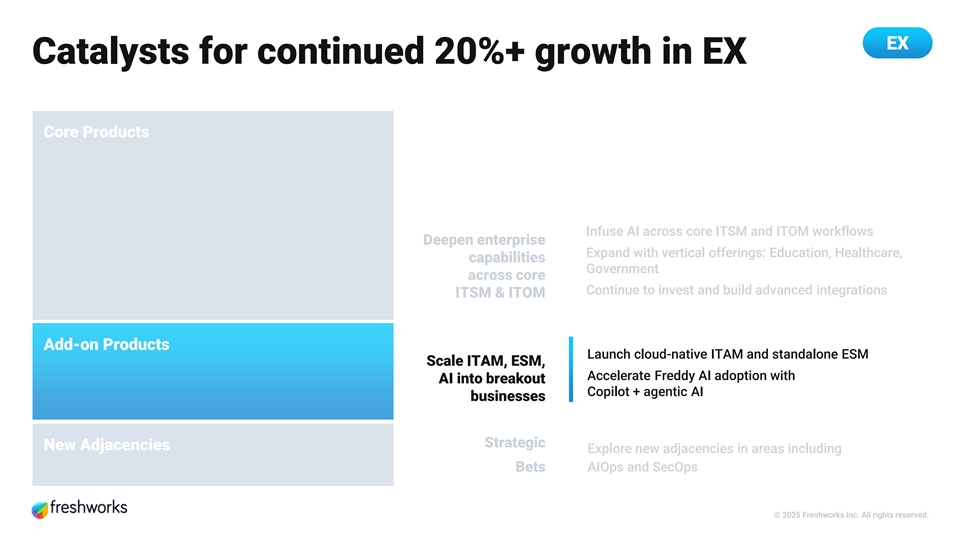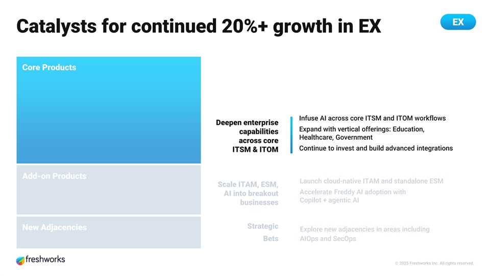 EX Catalysts for continued 20%+ growth in EX Core Products New Adjacencies Infuse AI across core ITSM and ITOM workflows Deepen enterprise Expand with vertical offerings: Education, capabilities Healthcare, Government across core Continue to invest and build advanced integrations ITSM & ITOM Add-on Products Launch cloud-native ITAM and standalone ESM Scale ITAM, ESM, Accelerate Freddy AI adoption with AI into breakout Copilot + agentic AI businesses Strategic New Adjacencies Explore new adjacencies in areas including Bets AIOps and SecOps © 2025 Freshworks Inc. All rights reserved.