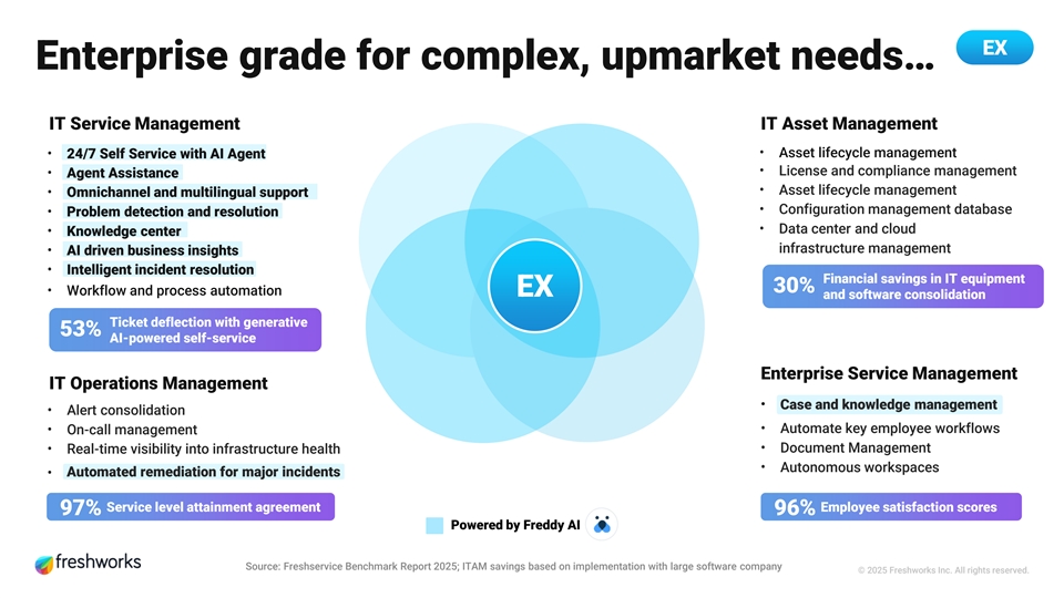 EX Enterprise grade for complex, upmarket needs… IT Service Management IT Asset Management • 24/7 Self Service with AI Agent• Asset lifecycle management • License and compliance management • Agent Assistance • Asset lifecycle management • Omnichannel and multilingual support • Configuration management database • Problem detection and resolution • Data center and cloud • Knowledge center infrastructure management • AI driven business insights • Intelligent incident resolution Financial savings in IT equipment 30% • Workflow and process automation EX and software consolidation Ticket deflection with generative 53% AI-powered self-service Enterprise Service Management IT Operations Management • Case and knowledge management • Alert consolidation • On-call management• Automate key employee workflows • Real-time visibility into infrastructure health• Document Management • Autonomous workspaces Automated remediation for major incidents • Service level attainment agreement Employee satisfaction scores 97% 96% Powered by Freddy AI Source: Freshservice Benchmark Report 2025; ITAM savings based on implementation with large software company © 2025 Freshworks Inc. All rights reserved.