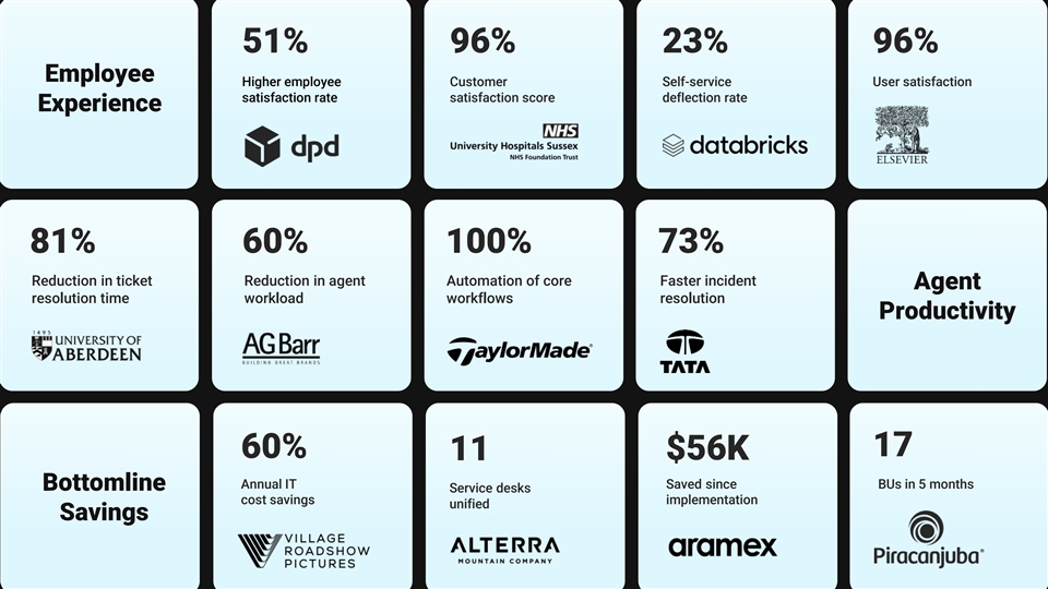 51% 96% 23% 96% Employee Higher employee Customer Self-service User satisfaction satisfaction rate satisfaction score deflection rate Experience 81% 60% 100% 73% Reduction in ticket Reduction in agent Automation of core Faster incident Agent resolution time workload workflows resolution Productivity 17 60% $56K 11 Annual IT Saved since BUs in 5 months Bottomline Service desks cost savings implementation unified Savings