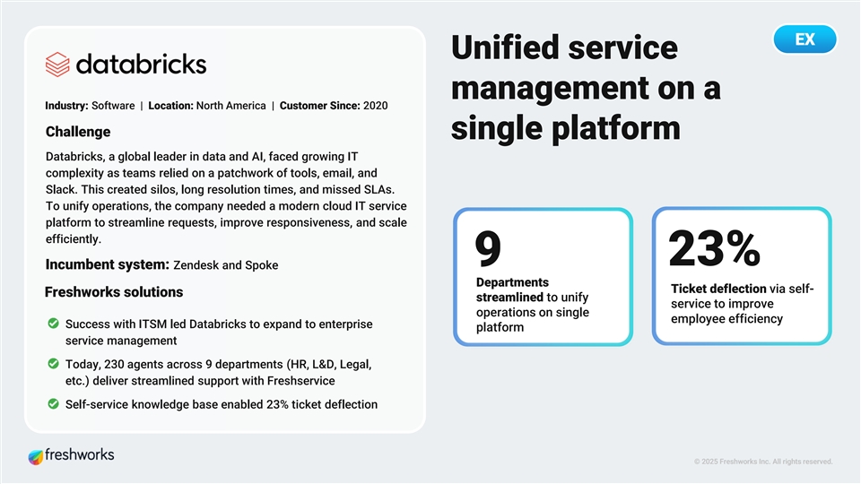 EX Unified service management on a Industry: Software | Location: North America | Customer Since: 2020 Challenge single platform Databricks, a global leader in data and AI, faced growing IT complexity as teams relied on a patchwork of tools, email, and Slack. This created silos, long resolution times, and missed SLAs. To unify operations, the company needed a modern cloud IT service platform to streamline requests, improve responsiveness, and scale efficiently. 23% 9 Incumbent system: Zendesk and Spoke Departments Ticket deflection via self- Freshworks solutions streamlined to unify service to improve operations on single employee efficiency Success with ITSM led Databricks to expand to enterprise platform service management Today, 230 agents across 9 departments (HR, L&D, Legal, etc.) deliver streamlined support with Freshservice Self-service knowledge base enabled 23% ticket deflection © © 2 20 02 25 5 F Fr re es sh hwo wor rks ks Inc. Inc. All All r ri ig gh ht ts s r re es se er rv ve ed d. .