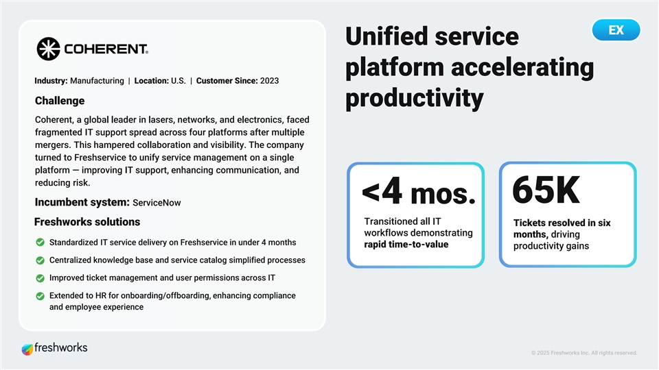 EX Unified service platform accelerating Industry: Manufacturing | Location: U.S. | Customer Since: 2023 Challenge productivity Coherent, a global leader in lasers, networks, and electronics, faced fragmented IT support spread across four platforms after multiple mergers. This hampered collaboration and visibility. The company turned to Freshservice to unify service management on a single platform — improving IT support, enhancing communication, and reducing risk. 65K <4 mos. Incumbent system: ServiceNow Transitioned all IT Freshworks solutions Tickets resolved in six workflows demonstrating months, driving Standardized IT service delivery on Freshservice in under 4 months rapid time-to-value productivity gains Centralized knowledge base and service catalog simplified processes Improved ticket management and user permissions across IT Extended to HR for onboarding/offboarding, enhancing compliance and employee experience © © 2 20 02 25 5 F Fr re es sh hwo wor rks ks Inc. Inc. All All r ri ig gh ht ts s r re es se er rv ve ed d. .