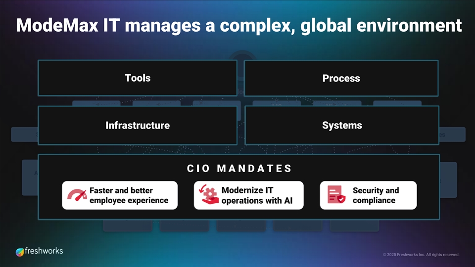 ModeMax IT manages a complex, global environment Tools Process Global locations Global locations MS Virtual Walk ins Emails Slack Phone Teams meetings Systems Infrastructure Sales Customer support HR Finance Legal Facilities Access C I O M A N D A T E S Collaboration CRM Alerts & Endpoint Remote Support DevOps Device Management Management Management Faster and better Modernize IT Security and employee experience compliance operations with AI Document Project Knowledge HR Management CTI Management Management Management © 2025 Freshworks Inc. All rights reserved.