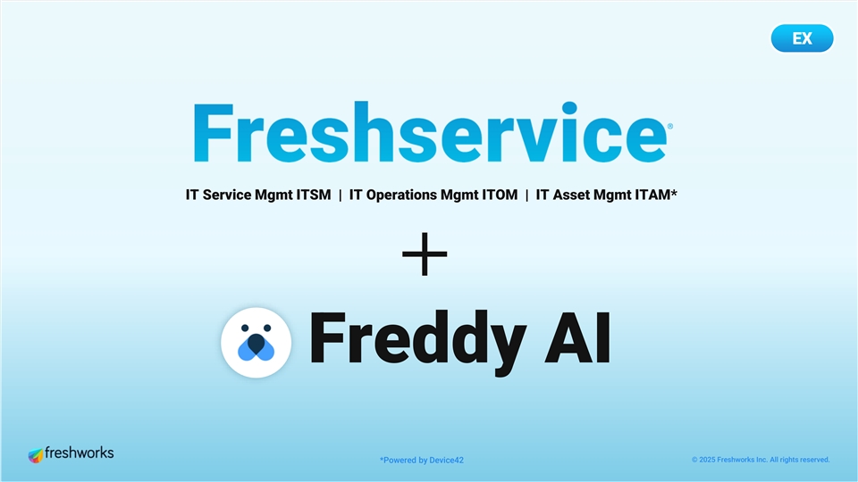 EX EX IT Service Mgmt ITSM | IT Operations Mgmt ITOM | IT Asset Mgmt ITAM* Freddy AI © 2025 Freshworks Inc. All rights reserved. *Powered by Device42