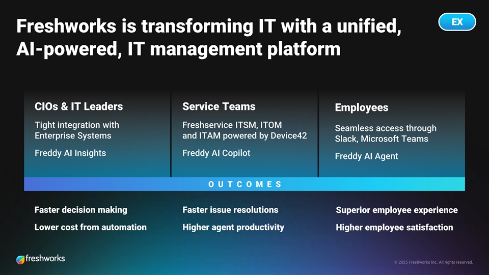 EX Freshworks is transforming IT with a unified, AI-powered, IT management platform CIOs & IT Leaders Service Teams Employees Tight integration with Freshservice ITSM, ITOM Seamless access through Enterprise Systems and ITAM powered by Device42 Slack, Microsoft Teams Freddy AI Insights Freddy AI Copilot Freddy AI Agent O U T C O M E S Faster decision making Faster issue resolutions Superior employee experience Lower cost from automation Higher agent productivity Higher employee satisfaction © 2025 Freshworks Inc. All rights reserved.