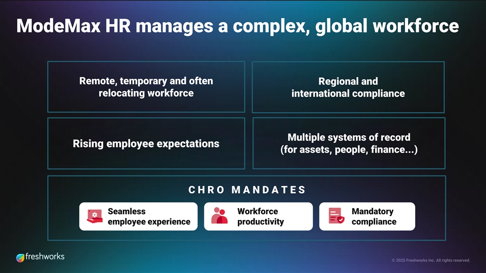 ModeMax HR manages a complex, global workforce Remote, temporary and often Regional and relocating workforce international compliance Multiple systems of record Rising employee expectations (for assets, people, finance...) C H R O M A N D A T E S Seamless Workforce Mandatory employee experience productivity compliance © 2025 Freshworks Inc. All rights reserved.