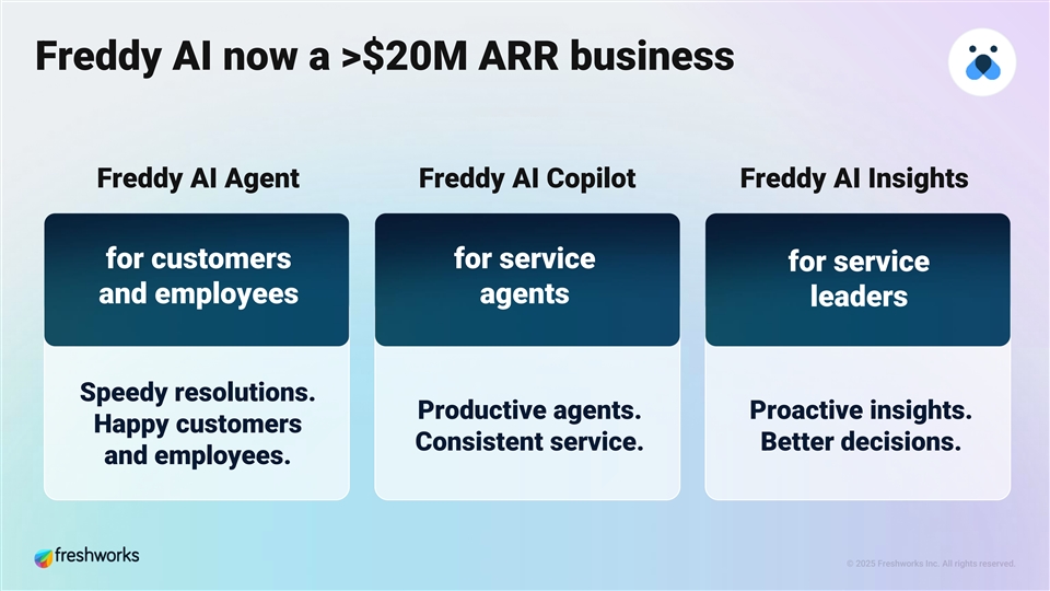 Freddy AI now a >$20M ARR business Freddy AI Agent Freddy AI Copilot Freddy AI Insights for customers for service for service and employees agents leaders Speedy resolutions. Productive agents. Proactive insights. Happy customers Consistent service. Better decisions. and employees. © 2025 Freshworks Inc. All rights reserved.