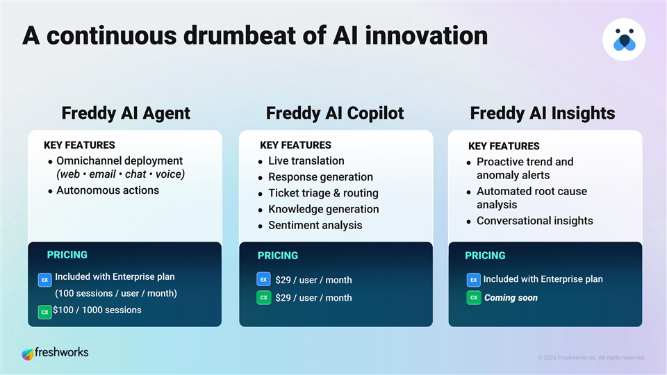 A continuous drumbeat of AI innovation Freddy AI Agent Freddy AI Copilot Freddy AI Insights KEY FEATURES KEY FEATURES KEY FEATURES ● Omnichannel deployment● Live translation ● Proactive trend and (web • email • chat • voice) anomaly alerts ● Response generation ● Autonomous actions ● Automated root cause ● Ticket triage & routing analysis ● Knowledge generation ● Conversational insights ● Sentiment analysis PRICING PRICING PRICING Included with Enterprise plan EX EX EX Included with Enterprise plan $29 / user / month (100 sessions / user / month) CX CX $29 / user / month Coming soon $100 / 1000 sessions CX © 2025 Freshworks Inc. All rights reserved.