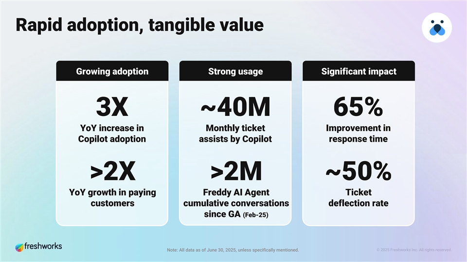 Rapid adoption, tangible value Growing adoption Strong usage Significant impact 3X ~40M 65% YoY increase in Monthly ticket Improvement in Copilot adoption assists by Copilot response time >2X >2M ~50% YoY growth in paying Freddy AI Agent Ticket customers cumulative conversations deflection rate since GA (Feb-25) © 2025 Freshworks Inc. All rights reserved. Note: All data as of June 30, 2025, unless specifically mentioned.