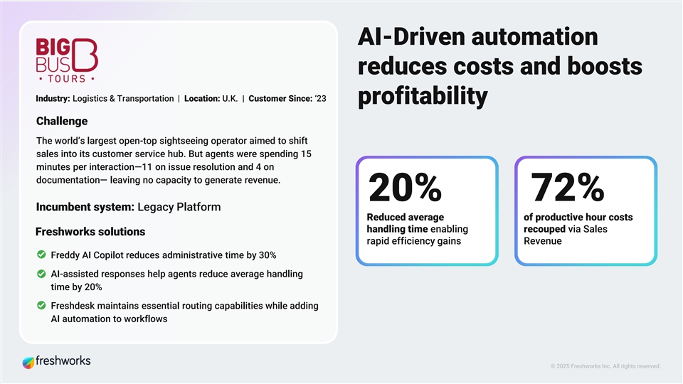 AI-Driven automation reduces costs and boosts Industry: Logistics & Transportation | Location: U.K. | Customer Since: ‘23 profitability Challenge The world’s largest open-top sightseeing operator aimed to shift sales into its customer service hub. But agents were spending 15 minutes per interaction—11 on issue resolution and 4 on documentation— leaving no capacity to generate revenue. 20% 72% Incumbent system: Legacy Platform Reduced average of productive hour costs handling time enabling recouped via Sales Freshworks solutions rapid efficiency gains Revenue Freddy AI Copilot reduces administrative time by 30% AI-assisted responses help agents reduce average handling time by 20% Freshdesk maintains essential routing capabilities while adding AI automation to workflows © © 2 20 02 25 5 F Fr re es sh hwo wor rks ks Inc. Inc. All All r ri ig gh ht ts s r re es se er rv ve ed d. .