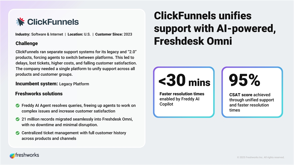 ClickFunnels unifies support with AI-powered, Industry: Software & Internet | Location: U.S. | Customer Since: 2023 Freshdesk Omni Challenge ClickFunnels ran separate support systems for its legacy and “2.0” products, forcing agents to switch between platforms. This led to delays, lost tickets, higher costs, and falling customer satisfaction. The company needed a single platform to unify support across all products and customer groups. Incumbent system: Legacy Platform <30 mins 95% Freshworks solutions Faster resolution times CSAT score achieved enabled by Freddy AI through unified support Copilot Freddy AI Agent resolves queries, freeing up agents to work on and faster resolution times complex issues and increase customer satisfaction 21 million records migrated seamlessly into Freshdesk Omni, with no downtime and minimal disruption. Centralized ticket management with full customer history across products and channels © © 2 20 02 25 5 F Fr re es sh hwo wor rks ks Inc. Inc. All All r ri ig gh ht ts s r re es se er rv ve ed d. .