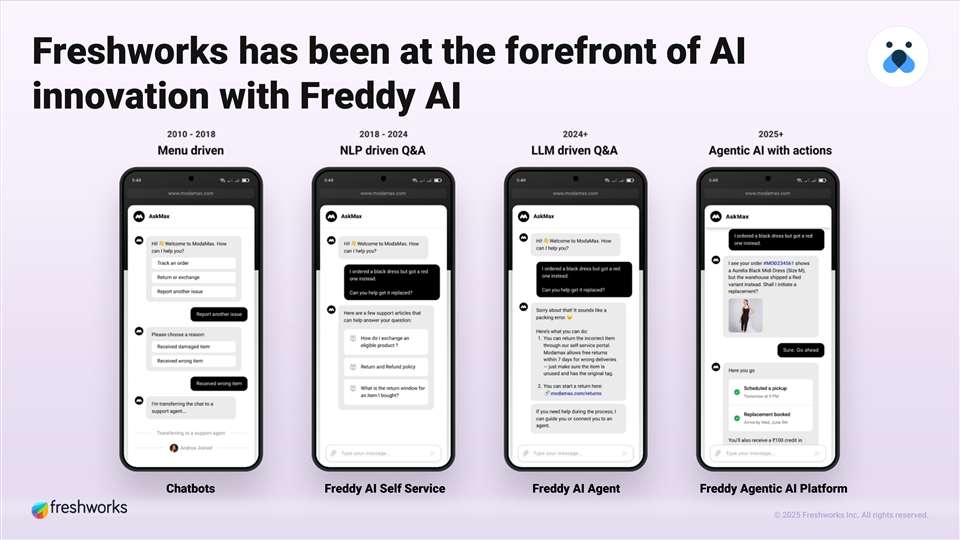 Freshworks has been at the forefront of AI innovation with Freddy AI Chatbots Freddy AI Self Service Freddy AI Agent Freddy Agentic AI Platform © 2025 Freshworks Inc. All rights reserved.