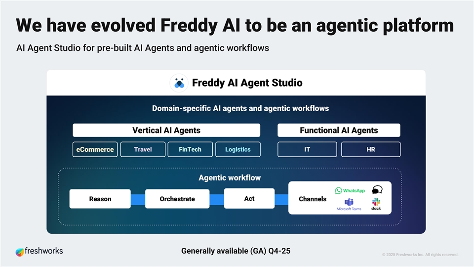 We have evolved Freddy AI to be an agentic platform AI Agent Studio for pre-built AI Agents and agentic workflows Freddy AI Agent Studio Domain-specific AI agents and agentic workflows Vertical AI Agents Functional AI Agents eCommerce Travel FinTech Logistics IT HR Agentic workflow Reason Orchestrate Act Channels Generally available (GA) Q4-25 © © 2 20 02 25 5 F Fr re es sh hwo wor rks ks Inc. Inc. All All r ri ig gh ht ts s r re es se er rv ve ed d. .