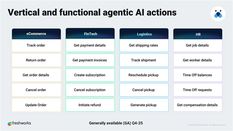 Vertical and functional agentic AI actions eCommerce FinTech Logistics HR Track order Get payment details Get shipping rates Get job details Return order Get payment invoices Track shipment Get worker details Get order details Create subscription Reschedule pickup Time Off balances Cancel order Cancel subscription Cancel pickup Time Off requests Update Order Initiate refund Generate pickup Get compensation details Generally available (GA) Q4-25 © 2025 Freshworks Inc. All rights reserved.