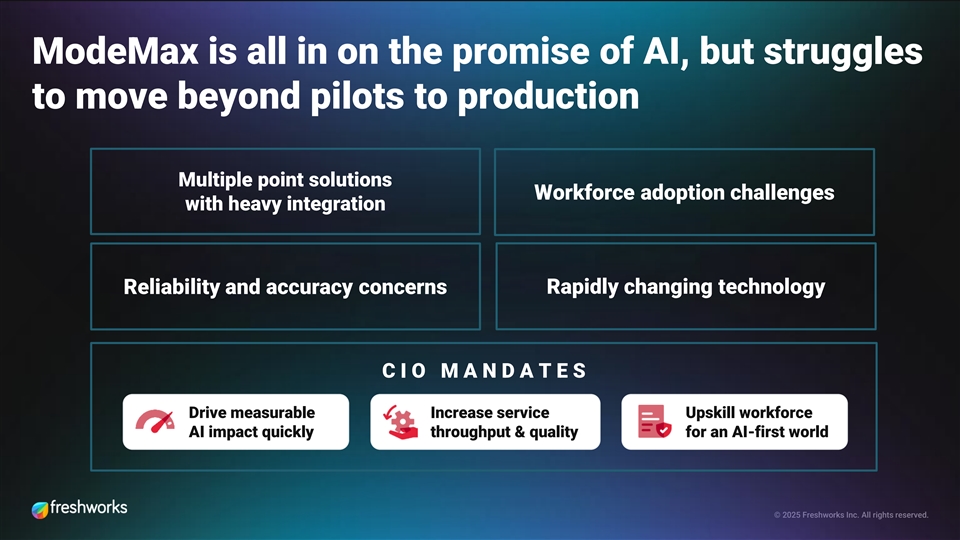 ModeMax is all in on the promise of AI, but struggles to move beyond pilots to production Multiple point solutions Workforce adoption challenges with heavy integration Reliability and accuracy concerns Rapidly changing technology C I O M A N D A T E S Drive measurable Increase service Upskill workforce AI impact quickly throughput & quality for an AI-first world © 2025 Freshworks Inc. All rights reserved.