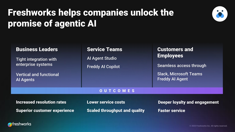 Freshworks helps companies unlock the promise of agentic AI Business Leaders Service Teams Customers and Employees AI Agent Studio Tight integration with enterprise systems Seamless access through Freddy AI Copilot Slack, Microsoft Teams Vertical and functional Freddy AI Agent AI Agents O U T C O M E S Increased resolution rates Lower service costs Deeper loyalty and engagement Superior customer experience Scaled throughput and quality Faster service © 2025 Freshworks Inc. All rights reserved.