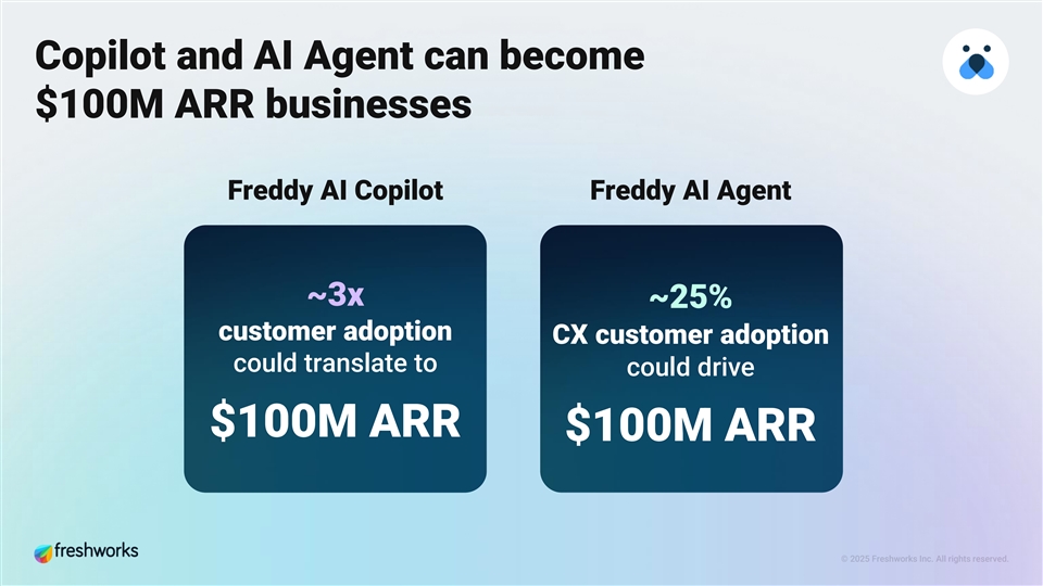 Copilot and AI Agent can become $100M ARR businesses Freddy AI Copilot Freddy AI Agent ~3x ~25% customer adoption CX customer adoption could translate to could drive $100M ARR $100M ARR © 2025 Freshworks Inc. All rights reserved.