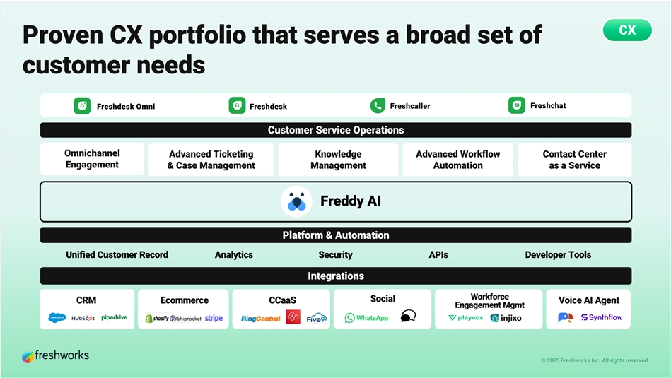 CX Catalysts to strengthen CX portfolio Core Products Strengthen Build ticketing depth and expand multi-channel and streamline and multi-modal (text, voice, and beyond in one unified workspace) product portfolio Add-on Products Launch library of AI Agents, enable Scale Agentic multi-agent orchestration AI into breakout businesses Expand into Voice AI Agents Advanced CCaaS, Workforce New Adjacencies Strategic Engagement, Field Service Management, Bets and Voice of Customer © 2025 Freshworks Inc. All rights reserved.