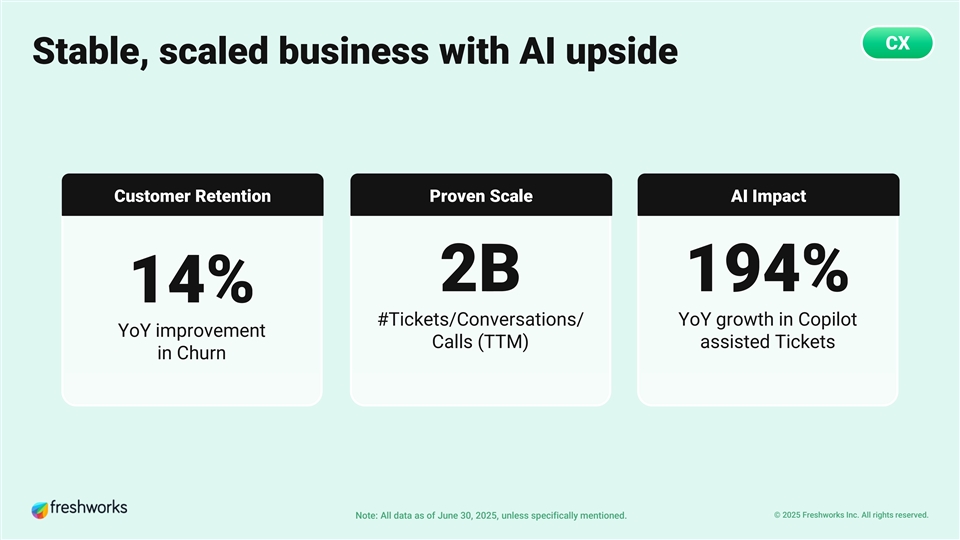 CX Stable, scaled business with AI upside Customer Retention Proven Scale AI Impact 2B 194% 14% #Tickets/Conversations/ YoY growth in Copilot YoY improvement Calls (TTM) assisted Tickets in Churn © 2025 Freshworks Inc. All rights reserved. Note: All data as of June 30, 2025, unless specifically mentioned.