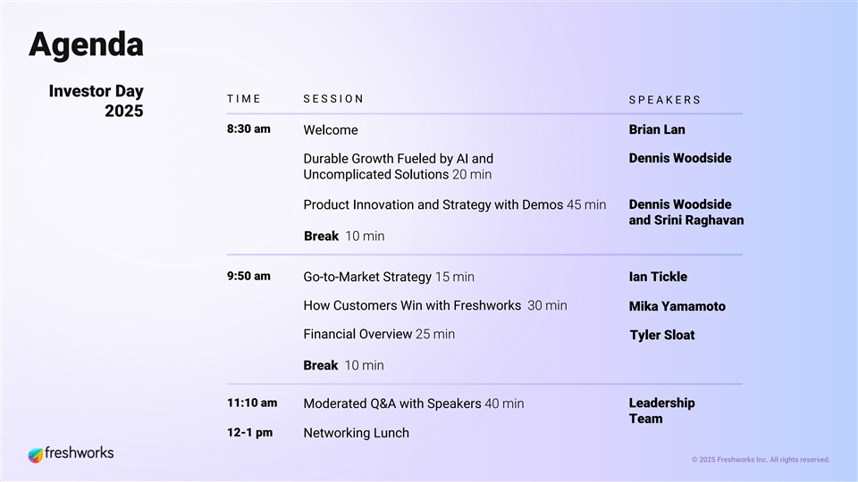 Agenda Investor Day T I M E S E S S I O N S P E A K E R S 2025 8:30 am Welcome Brian Lan Durable Growth Fueled by AI and Dennis Woodside Uncomplicated Solutions 20 min Product Innovation and Strategy with Demos 45 min Dennis Woodside and Srini Raghavan Break 10 min 9:50 am Ian Tickle Go-to-Market Strategy 15 min How Customers Win with Freshworks 30 min Mika Yamamoto Financial Overview 25 min Tyler Sloat Break 10 min 11:10 am Leadership Moderated Q&A with Speakers 40 min Team 12-1 pm Networking Lunch © 2025 Freshworks Inc. All rights reserved.