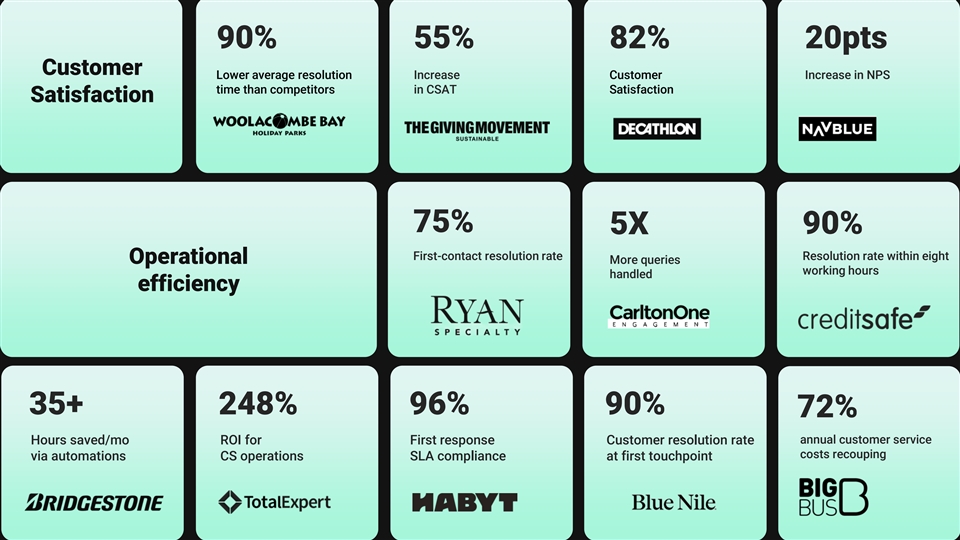90% 55% 82% 20pts Customer Lower average resolution Increase Customer Increase in NPS time than competitors in CSAT Satisfaction Satisfaction 75% 5X 90% First-contact resolution rate Resolution rate within eight Operational More queries working hours handled efficiency 35+ 248% 96% 90% 72% annual customer service Hours saved/mo ROI for First response Customer resolution rate costs recouping via automations CS operations SLA compliance at first touchpoint