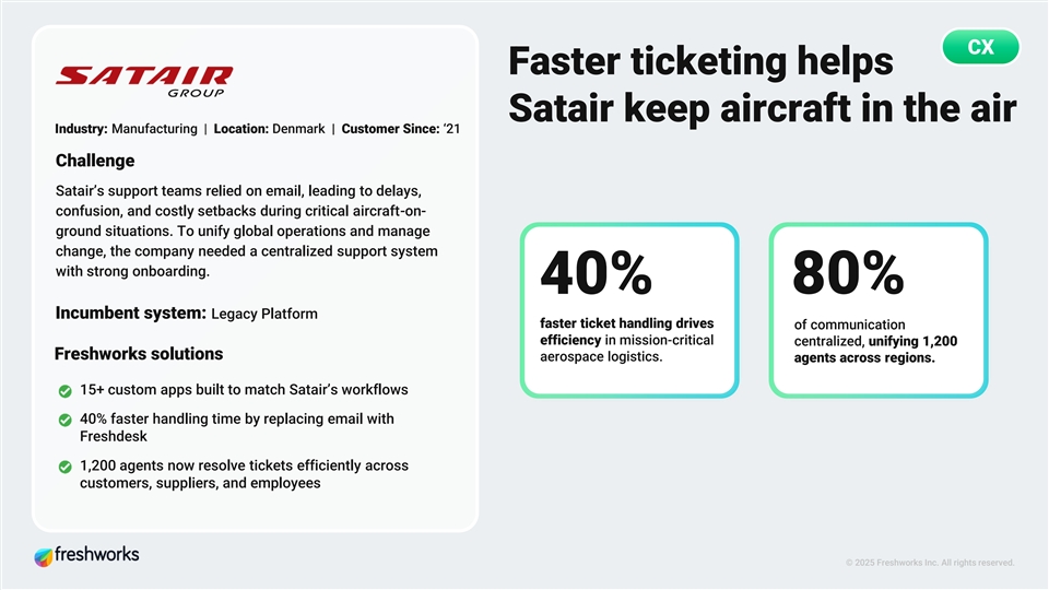 CX Faster ticketing helps Satair keep aircraft in the air Industry: Manufacturing | Location: Denmark | Customer Since: ‘21 Challenge Satair’s support teams relied on email, leading to delays, confusion, and costly setbacks during critical aircraft-on- ground situations. To unify global operations and manage change, the company needed a centralized support system with strong onboarding. 40% 80% Incumbent system: Legacy Platform faster ticket handling drives of communication efficiency in mission-critical centralized, unifying 1,200 Freshworks solutions aerospace logistics. agents across regions. 15+ custom apps built to match Satair’s workflows 40% faster handling time by replacing email with Freshdesk 1,200 agents now resolve tickets efficiently across customers, suppliers, and employees © 2025 Freshworks Inc. All rights reserved.