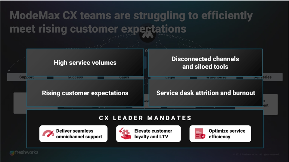 ModeMax CX teams are struggling to efficiently meet rising customer expectations Support Operations Disconnected channels Web Email Chat Phone Walk-ins Social High service volumes and siloed tools Support Success Sales Legal Warehouse Deliveries Rising customer expectations Service desk attrition and burnout Knowledge Base Ticketing Logistics Systems Analytics Survey Tools Logistics CRM Management C X L E A D E R M A N D A T E S Order Community Marketing Billing & Payments CTI Management Forums Automation Systems Deliver seamless Elevate customer Optimize service omnichannel support loyalty and LTV efficiency © 2025 Freshworks Inc. All rights reserved.
