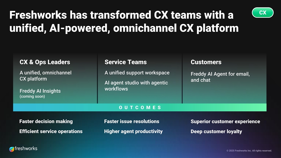 CX Freshworks has transformed CX teams with a unified, AI-powered, omnichannel CX platform CX & Ops Leaders Service Teams Customers A unified, omnichannel A unified support workspace Freddy AI Agent for email, CX platform and chat AI agent studio with agentic workflows Freddy AI Insights (coming soon) O U T C O M E S Faster decision making Faster issue resolutions Superior customer experience Efficient service operations Higher agent productivity Deep customer loyalty © 2025 Freshworks Inc. All rights reserved.