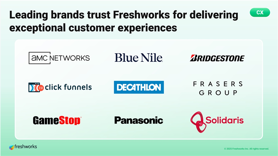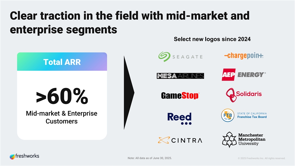 Clear traction in the field with mid-market and enterprise segments Select new logos since 2024 Total ARR >60% Mid-market & Enterprise Customers Note: All data as of June 30, 2025. © 2025 Freshworks Inc. All rights reserved.