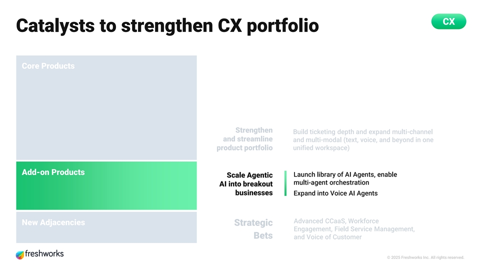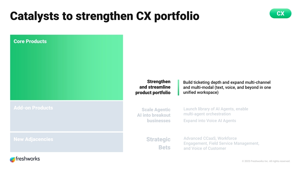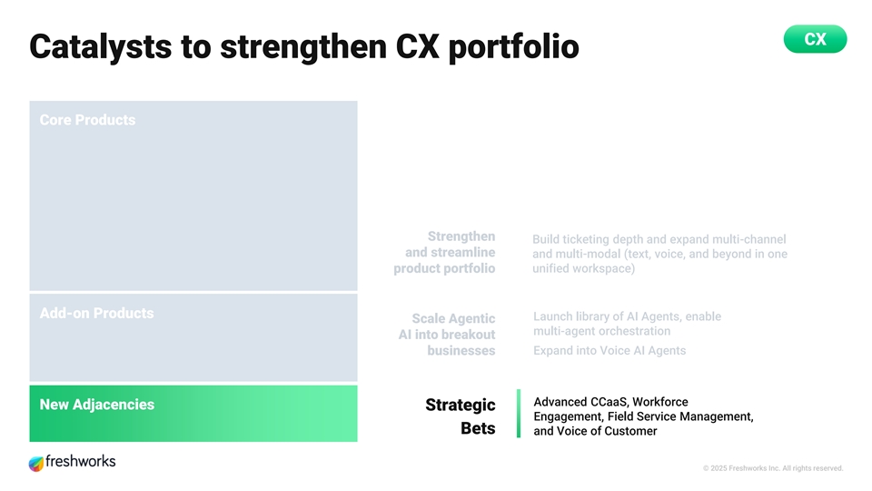 CX Catalysts to strengthen CX portfolio Core Products New Adjacencies Strengthen Build ticketing depth and expand multi-channel and streamline and multi-modal (text, voice, and beyond in one unified workspace) product portfolio Add-on Products Launch library of AI Agents, enable Scale Agentic multi-agent orchestration AI into breakout businesses Expand into Voice AI Agents Advanced CCaaS, Workforce New Adjacencies Strategic Engagement, Field Service Management, Bets and Voice of Customer © 2025 Freshworks Inc. All rights reserved.