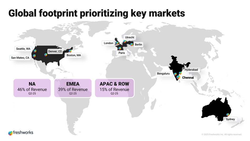 Global footprint prioritizing key markets Utrecht London Berlin Seattle, WA Denver, CO Paris Boston, MA San Mateo, CA Hyderabad Bengaluru Chennai NA EMEA APAC & ROW 46% of Revenue 39% of Revenue 15% of Revenue Q2-25 Q2-25 Q2-25 Sydney © 2025 Freshworks Inc. All rights reserved.
