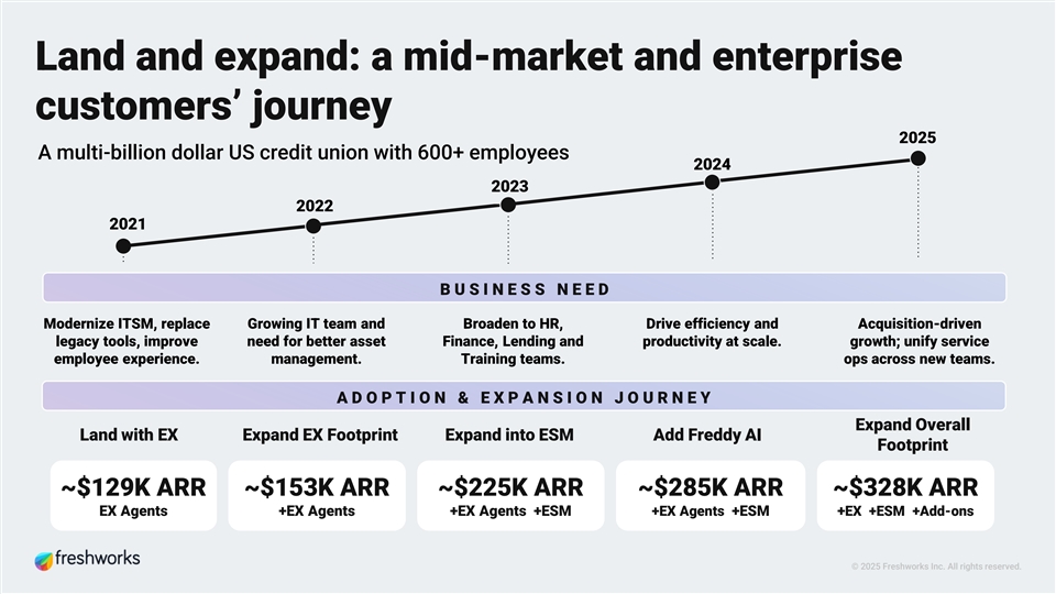 Land and expand: a mid-market and enterprise customers’ journey 2025 A multi-billion dollar US credit union with 600+ employees 2024 2023 2022 2021 B U S I N E S S N E E D Modernize ITSM, replace Growing IT team and Broaden to HR, Drive efficiency and Acquisition-driven legacy tools, improve need for better asset Finance, Lending and productivity at scale. growth; unify service employee experience. management. Training teams. ops across new teams. A D O P T I O N & E X P A N S I O N J O U R N E Y Expand Overall Land with EX Expand EX Footprint Expand into ESM Add Freddy AI Footprint ~$129K ARR ~$153K ARR ~$225K ARR ~$285K ARR ~$328K ARR EX Agents +EX Agents +EX Agents +ESM +EX Agents +ESM +EX +ESM +Add-ons © 2025 Freshworks Inc. All rights reserved.